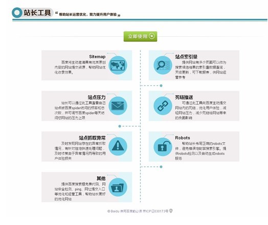 站長(zhǎng)可以通過工具區(qū)提供的死鏈推送、站點(diǎn)索引量查詢、站點(diǎn)抓取報(bào)錯(cuò)查詢、robots工具、站點(diǎn)壓力反饋和網(wǎng)站安全監(jiān)測(cè)等功能,減輕網(wǎng)站服務(wù)器壓力,提升網(wǎng)頁(yè)抓取效率和質(zhì)量,減少網(wǎng)站安全隱患,從而實(shí)現(xiàn)網(wǎng)站的精細(xì)化運(yùn)營(yíng)。資料區(qū)提供了搜索優(yōu)化案例、工具使用說明、網(wǎng)站運(yùn)營(yíng)經(jīng)驗(yàn)文檔,幫助站長(zhǎng)汲取網(wǎng)站運(yùn)營(yíng)經(jīng)驗(yàn)、夯實(shí)理論基礎(chǔ);站長(zhǎng)社區(qū)的則是站長(zhǎng)間溝通和分享的平臺(tái),既會(huì)定期組織交流活動(dòng)和分享討論,,有利于站長(zhǎng)們?nèi)¢L(zhǎng)補(bǔ)短提升網(wǎng)站運(yùn)作技巧,解決站長(zhǎng)面臨的典型問題。