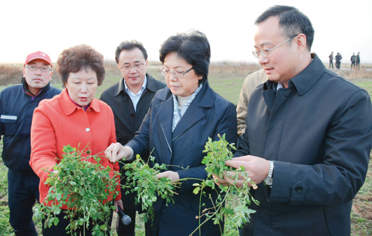 3日下午,李斌一行首先來到位于五河縣朱頂鎮(zhèn)的全國最大的紫花苜蓿生產(chǎn)基地——秋實(shí)草業(yè)有限公司調(diào)研。在市委書記周春雨、代市長白金明的陪同下,李斌深入田間察看牧草長勢,當(dāng)她得知牧草品質(zhì)上乘,草場機(jī)械化作業(yè)達(dá)到世界先進(jìn)水平時(shí),不住地點(diǎn)頭稱贊。調(diào)研中,李斌和在這里打工的女拖拉機(jī)手、朱頂鎮(zhèn)小柳村村民劉小紅拉起家常,希望她通過自己的努力過上更加幸福美好的生活。