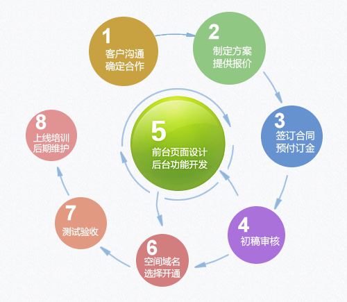 網(wǎng)站建設流程概述:客戶溝通,確定合作意向→制定建設方案,提供報價→簽訂合同,預付定金→初稿審核→前臺頁面設計,后臺程序開發(fā)→空間及域名選擇、開通→測試驗收→上線培訓,后期維護