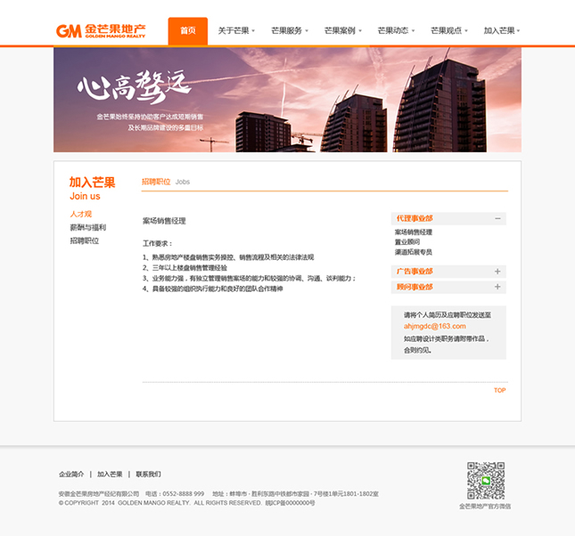金芒果基于對中國房地產(chǎn)的執(zhí)著追求,憑借對市場營銷的激情創(chuàng)新,以完全經(jīng)過市場檢驗的專家團隊和對市場的敏銳天賦,大膽構(gòu)思、執(zhí)著實踐、激情專注、科學(xué)分析,贏得了業(yè)主的廣泛認同和支持,并以優(yōu)異業(yè)績和服務(wù)質(zhì)量,被客戶譽為具實效、富激情、科學(xué)嚴謹?shù)膶I(yè)房地產(chǎn)服務(wù)商。